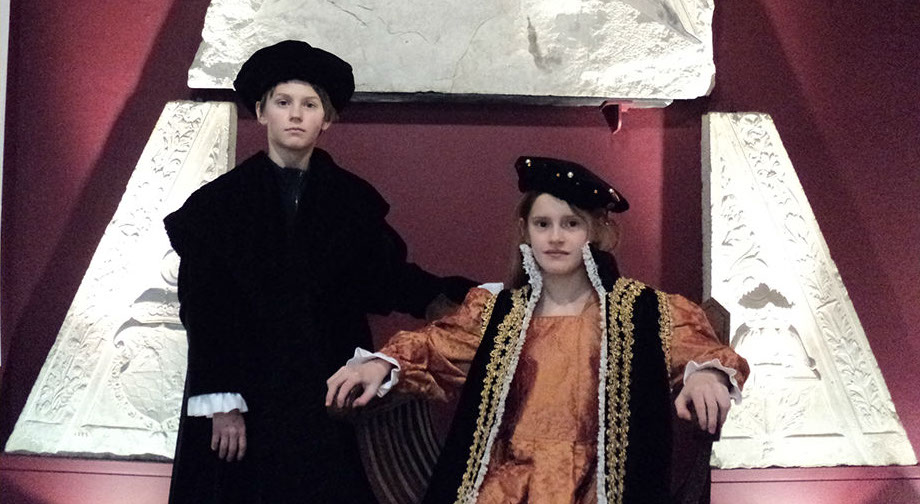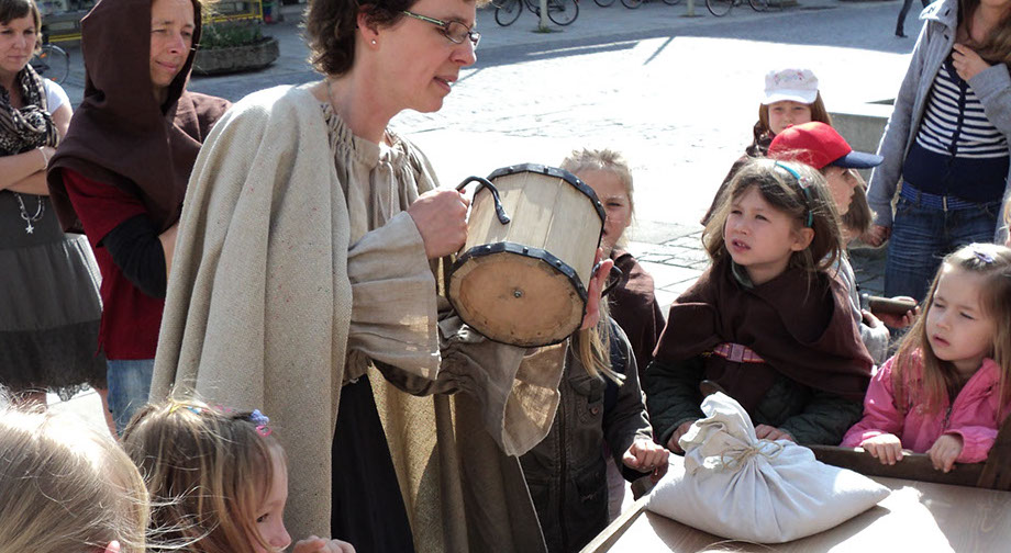 Nach einer Einführung im Stadtmuseum schlüpfen die Schüler mit "historischer" Kleidung, Musik und Tanz in unterschiedliche Rollen und begeben sich auf am Residenzplatz auf eine Zeitreise in das 16. Jahrhundert.