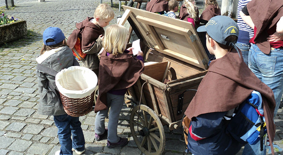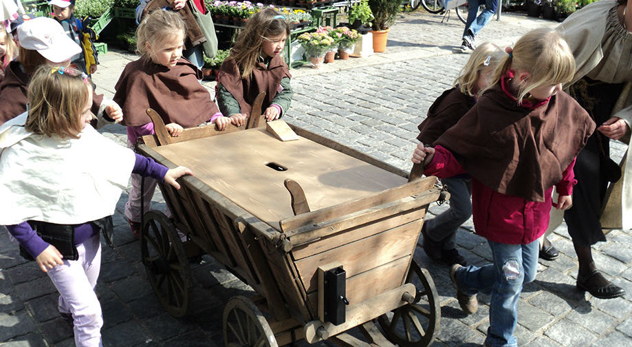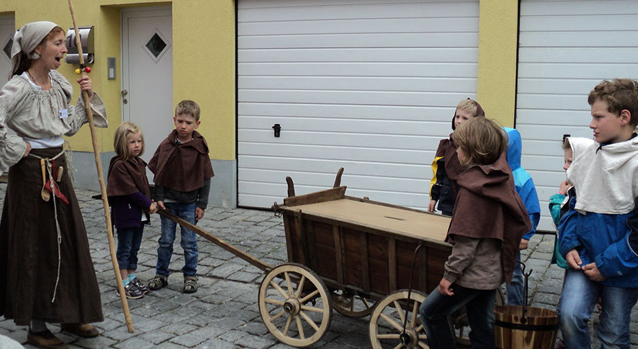 Hautnah erleben die Schülerinnen und Schüler die Bedeutung der verschiedenen Märkte und werden selbst als Marktleute aktiv, wobei sie sich mit alten Maßen und Gewichten vertraut machen. Der Leiterwagen verwandelt sich zum Marktstand und die Schülerinnen und Schüler preisen lautstark ihre Ware an.