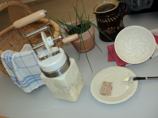 Im zweiten Teil unserer Führung vermittelt ein praktisches Beispiel neben dem für manuelle Herstellungsprozesse erforderlichen Körpereinsatz die Freude an selbsterzeugten Lebensmitteln und eine neue Wertschätzung. Wir stellen gemeinsam aus Rahm Butter her, die anschließend mit frischen Kräutern verkostet wird - lecker!